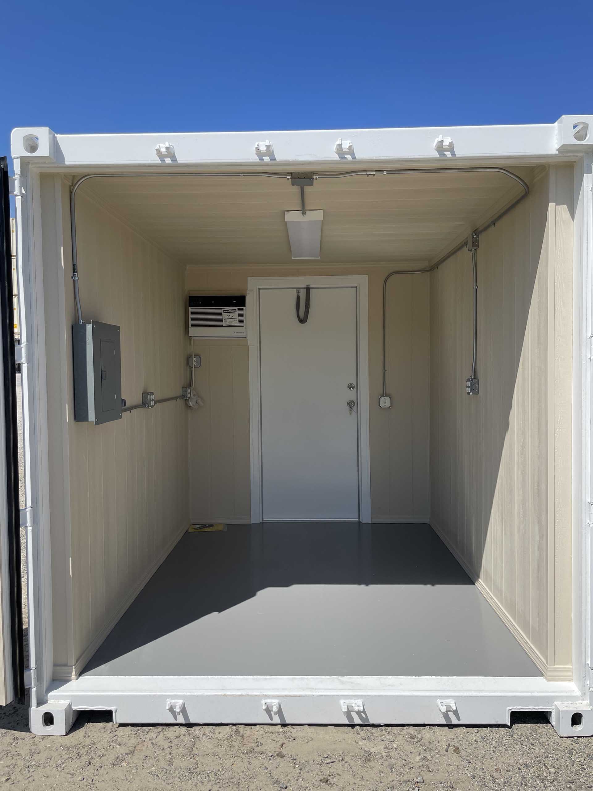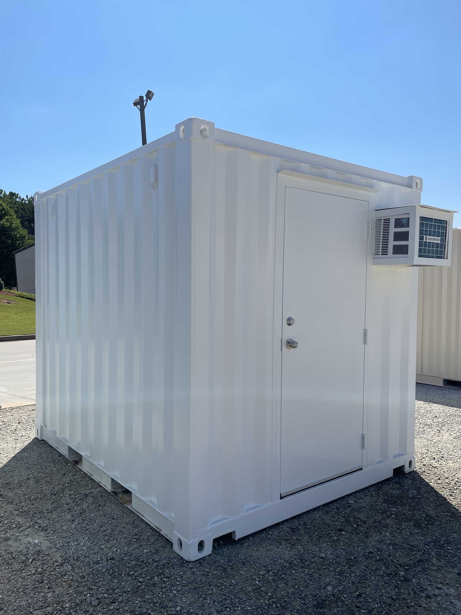 10ft Standard shipping container converted into temperature-controlled mobile office. The container is outfitted with a personnel door, finished interior, lights, outlets, and a small window HVAC unit. A vinyl overlay has been installed over the existing wood floor. The exterior has also been painted white.