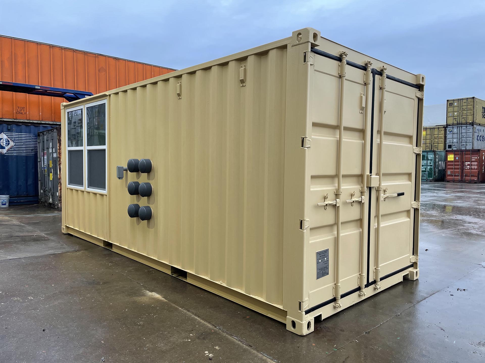 20ft Standard shipping container converted into textile plant operations unit. The container is outfitted with a personnel door, four large windows, the interior is finished, and electrical and HVAC is included. It’s also equipped with a 6’ workbench and the exterior has also been painted tan.