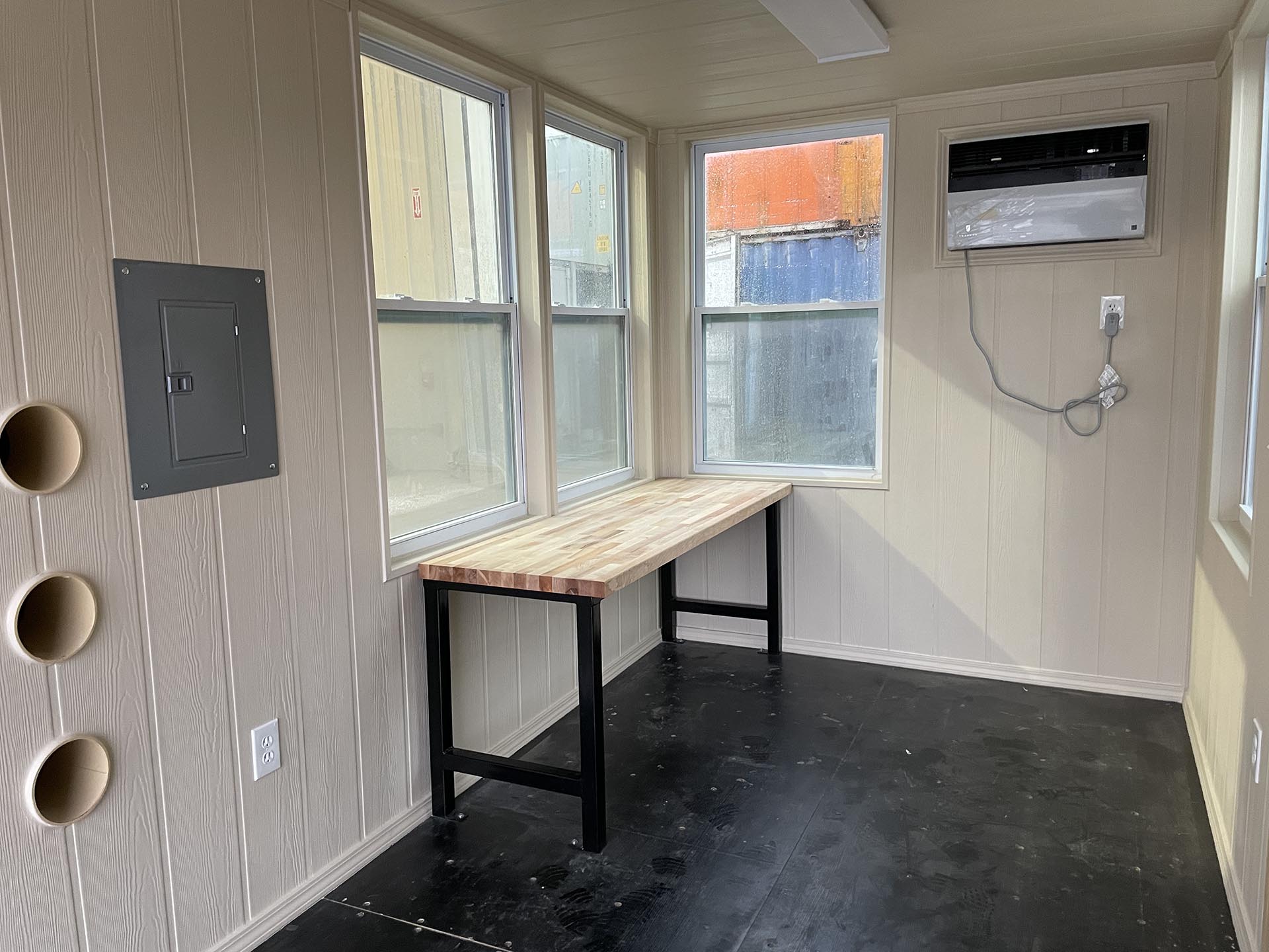 - (3) 4’ LED lights with switch, (6) 110V duplex receptacles, 100-amp panel stubbed to exterior for hardwiring