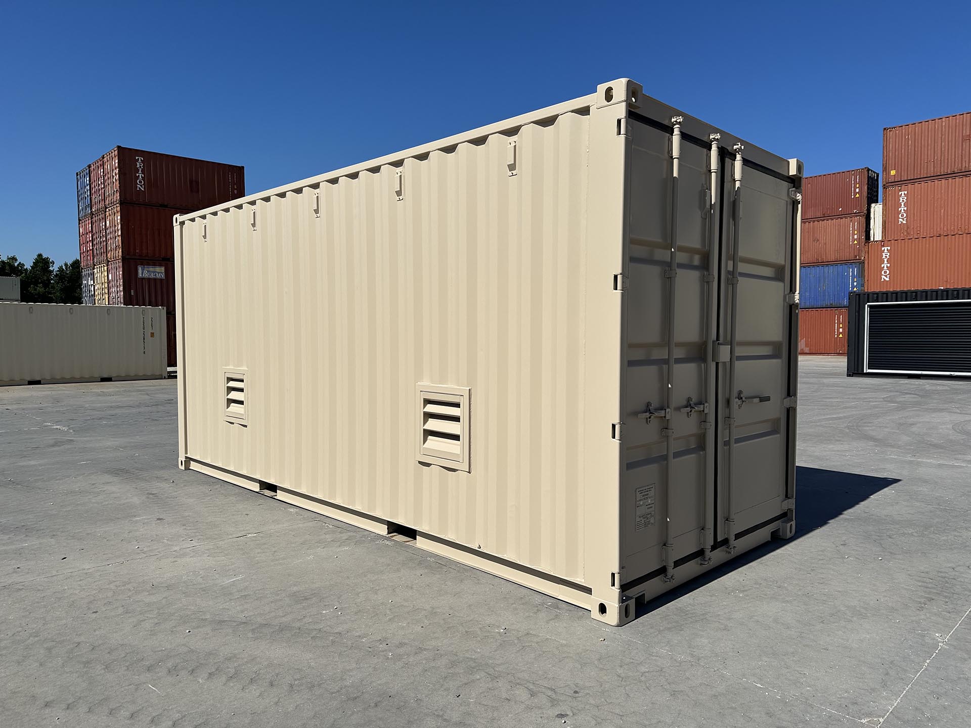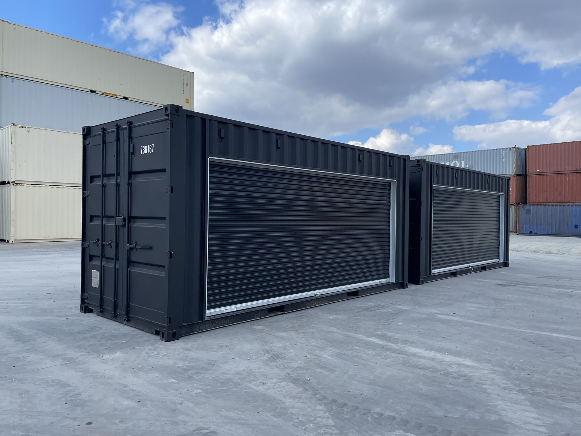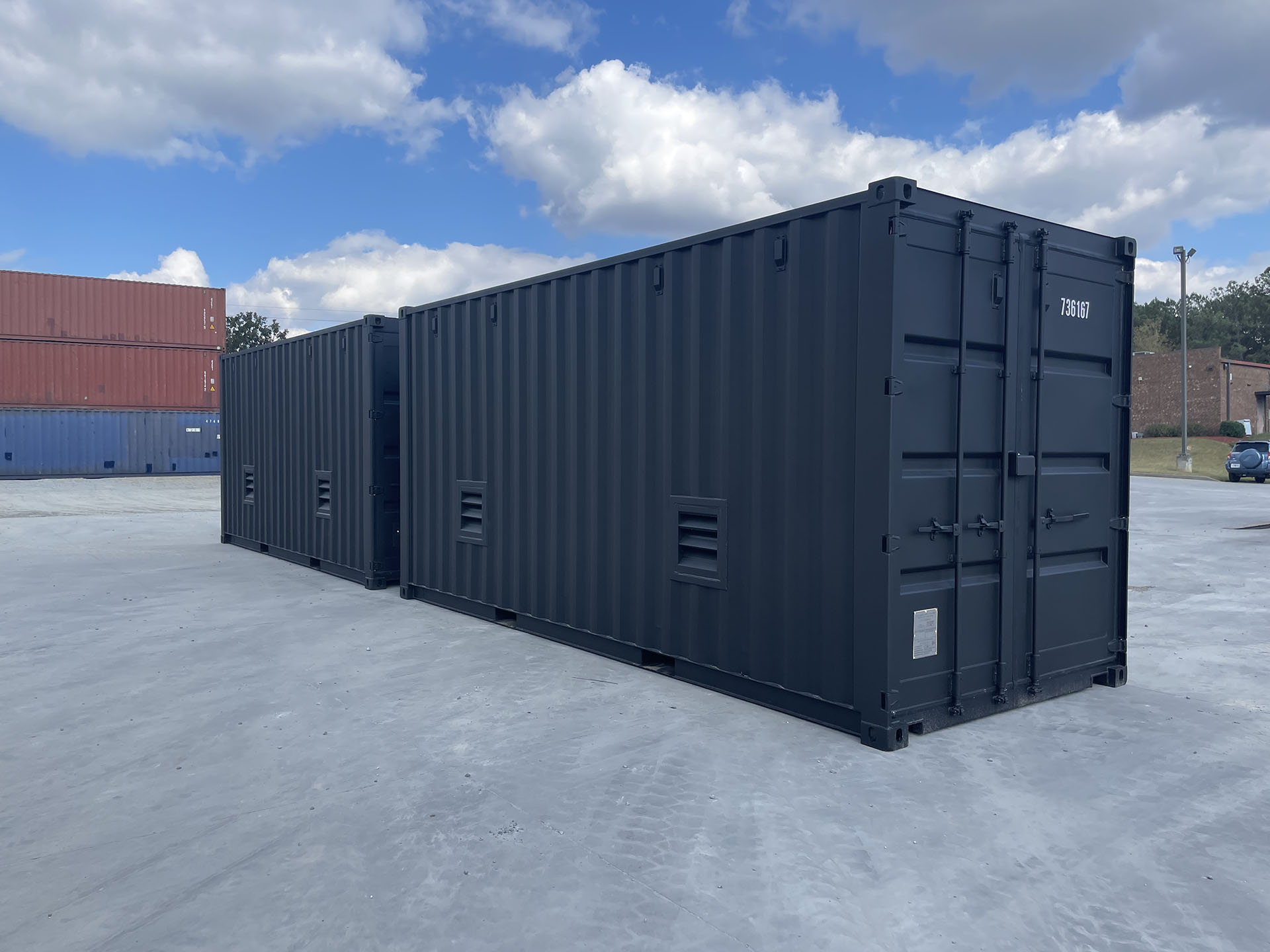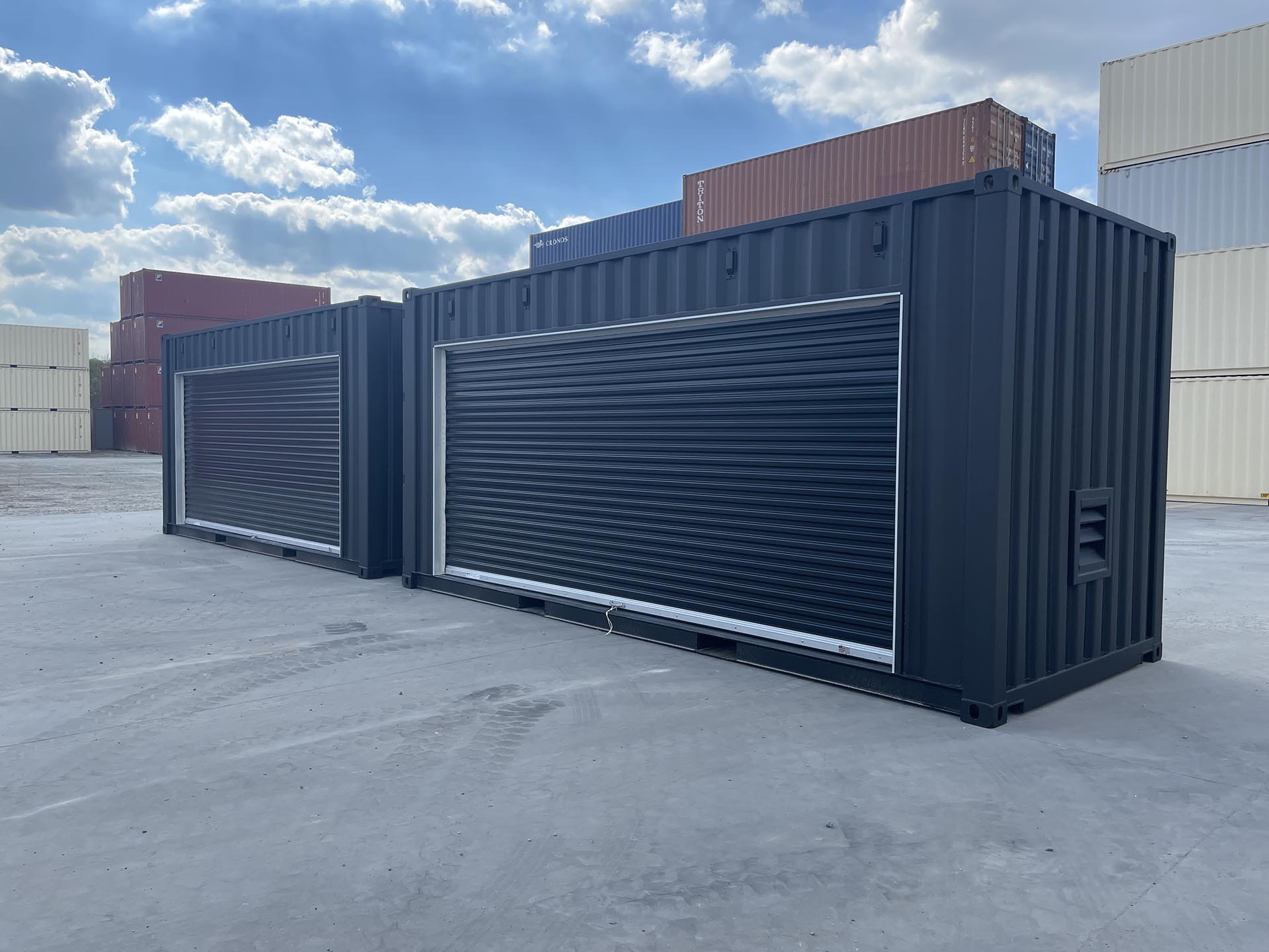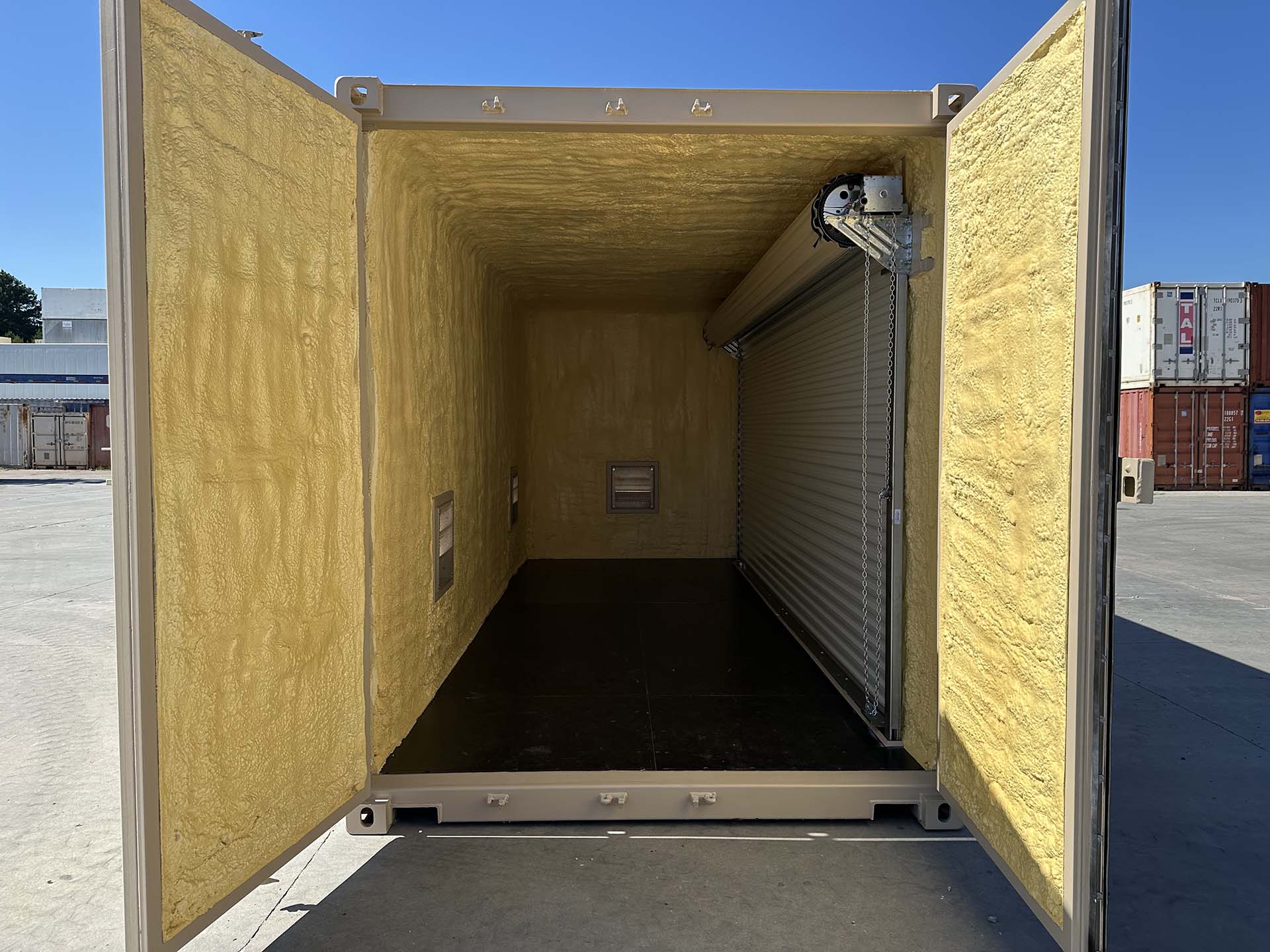 20ft High Cube shipping containers converted into EV battery storage units for automotive companies. Installed large 16ft chain hoist roll up door and multiple fixed louvre vents. The interior is insulated with spray closed cell foam and the exterior of containers are painted black and tan.
