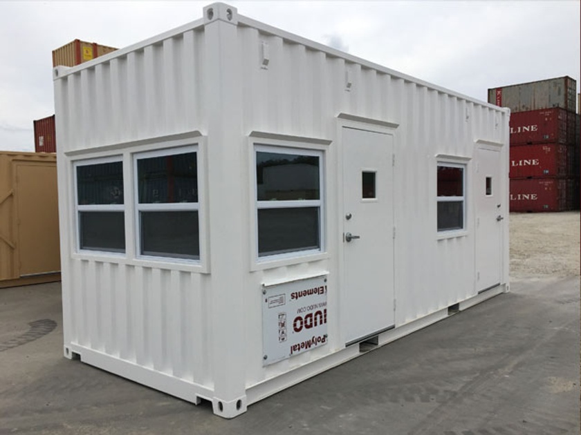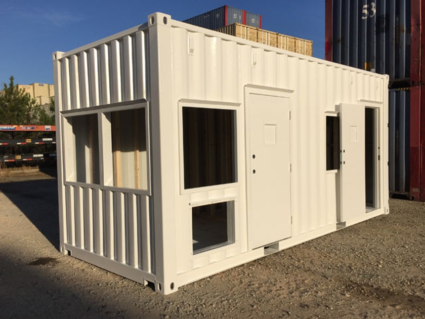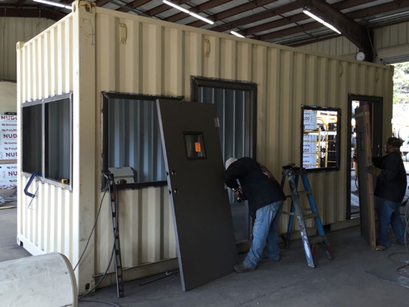 20ft High Cube shipping container converted into temperature controlled mobile control/equipment room. Two personnel doors were installed on one side of the container. A partition was also installed on the interior with a passage door. Electrical was installed throughout, including light, outlets, and two window AC/Heat units. The customer also requested that the floor be painted gray and the existing double doors be removed.