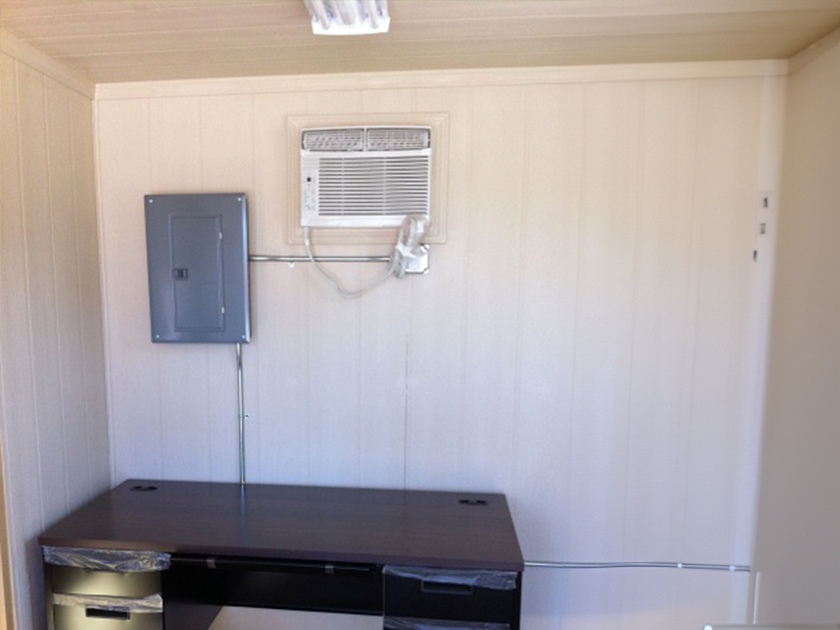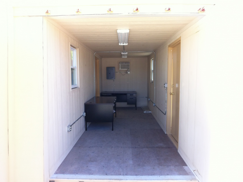 A shipping container is a great option, when considering a jobsite office. Shipping containers can be converted very easily and are portable as well. We offer many options when it comes to how your container can be outfitted. This is just one example of a 20ft storage container that we customized for one of our customers. The interior was finished and electrical was installed throughout. We also included a small desk and a few windows.