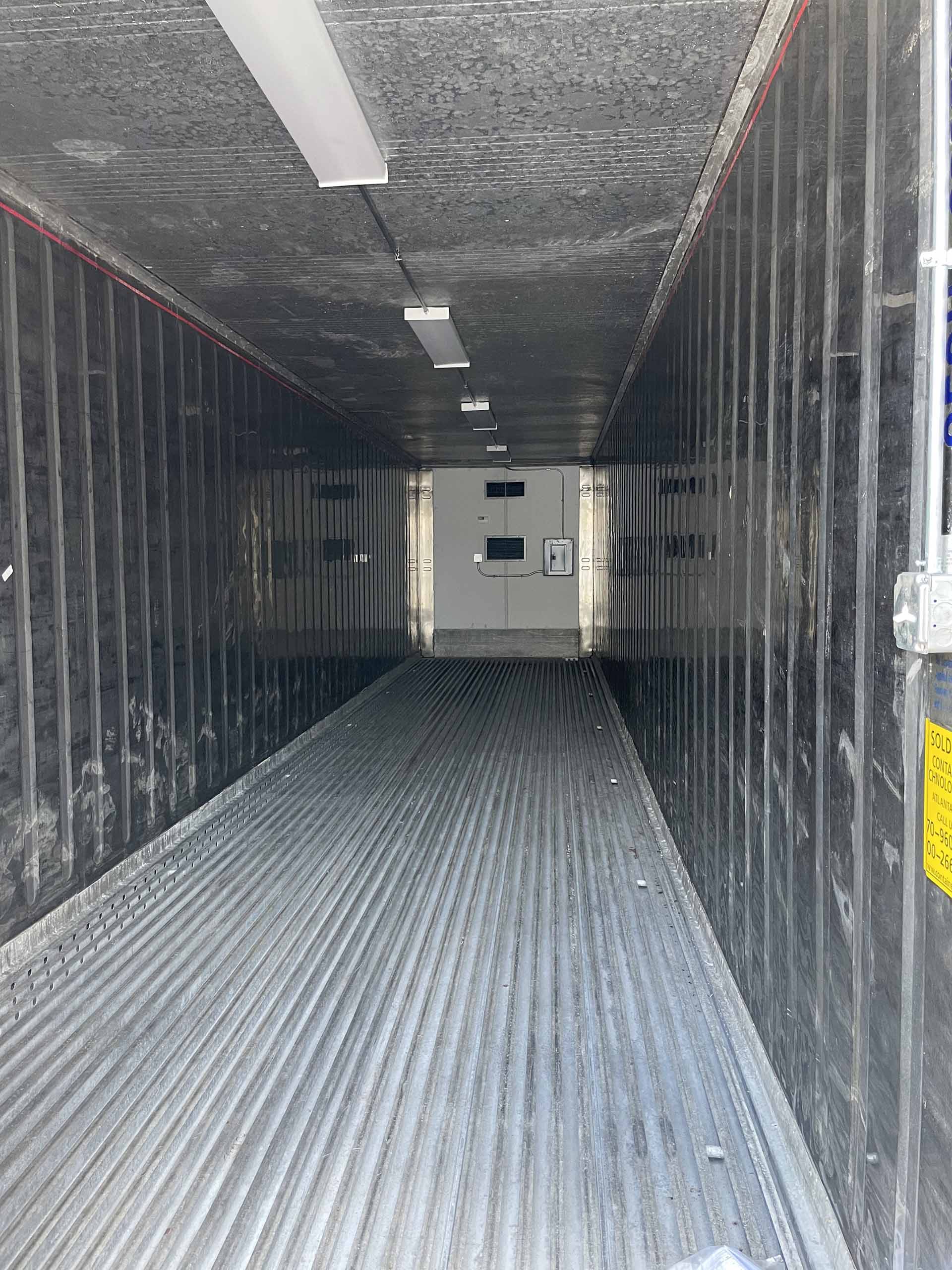 40ft Non-Working Reefer container converted into climate-controlled storage unit for power plant. The non-working cooling system was removed and replaced with a commercial through-wall HVAC system. The unit was outfitted with lights and outlets and the exterior was painted gray.