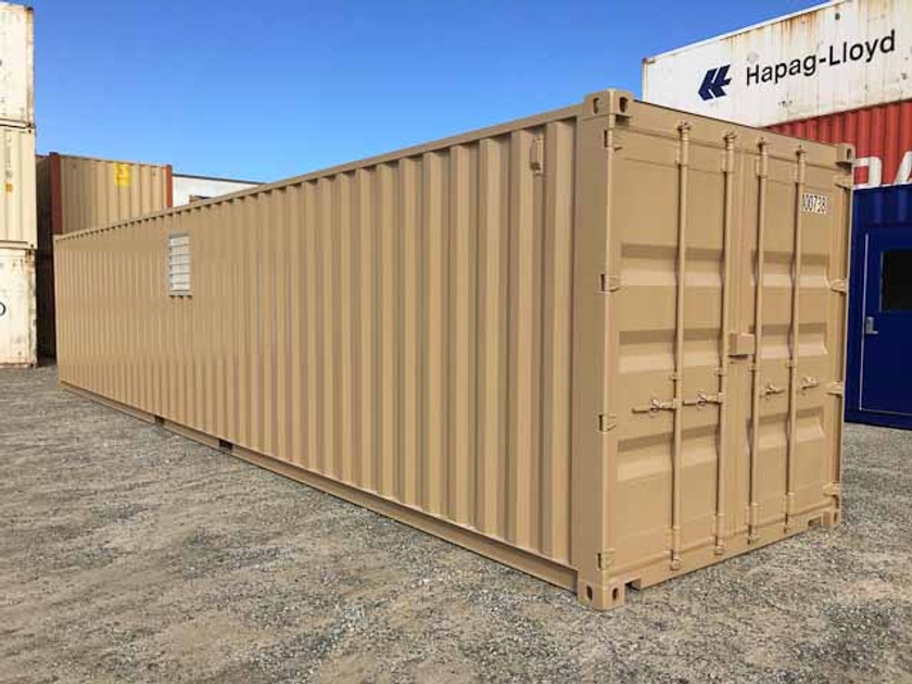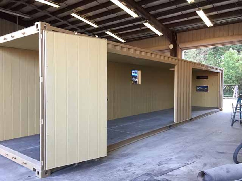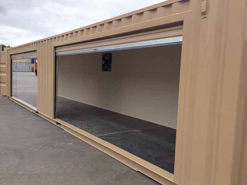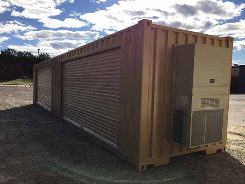 40ft Standard container converted into temperature controlled mini storage unit. Two large roll up doors were installed on one side to allow for larger items to be side loaded. Electrical was installed throughout, including lights, outlets, and a commercial HVAC system. The customer also requested a steel overlay on the floor.
