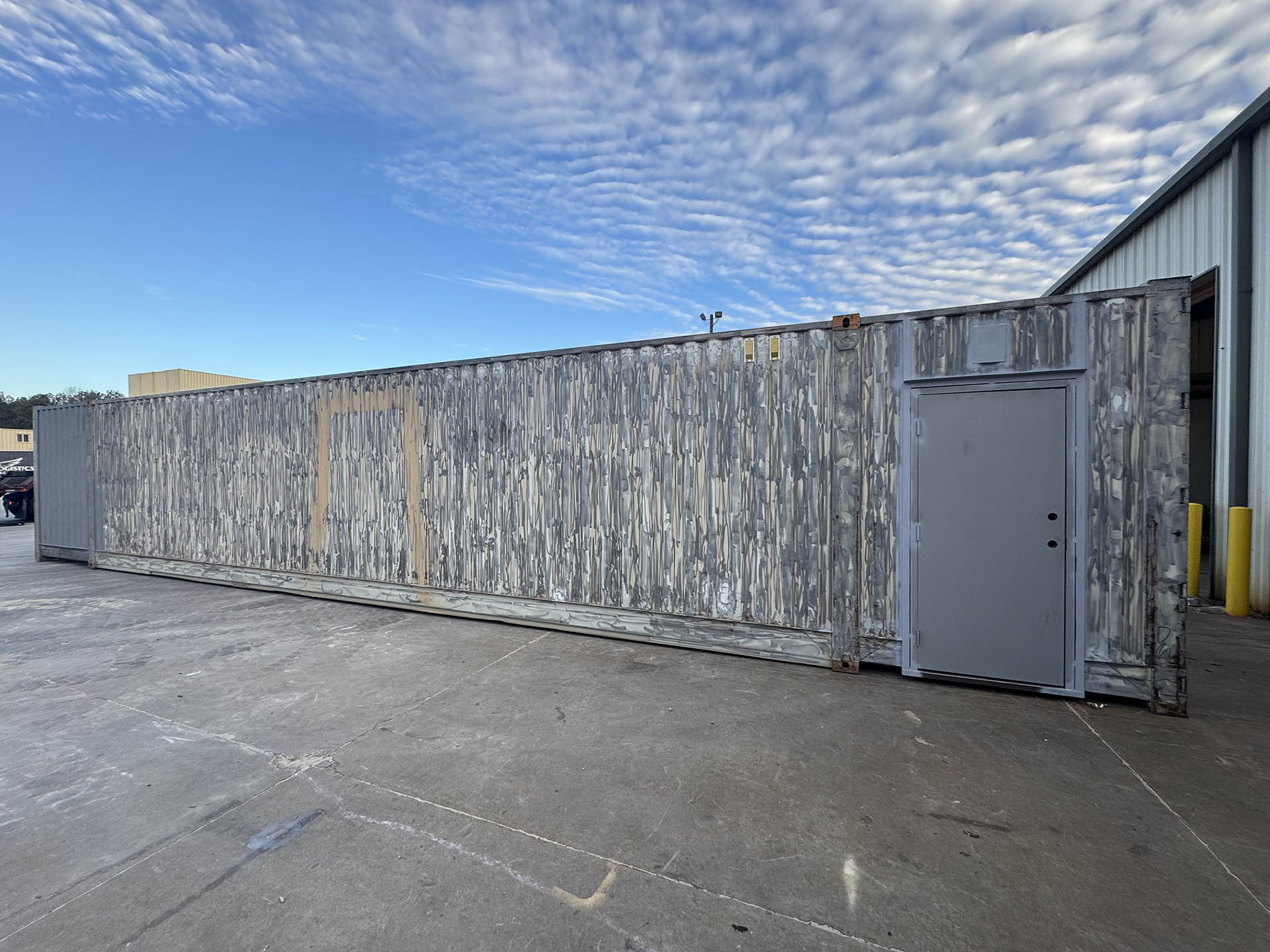 This 53’HC container was converted into a climate controlled mobile office space for a military base. The interior was completely finished and outfitted with lights, outlets, and a commercial HVAC system. An additional door was installed on the sidewall and the exterior was painted gray.