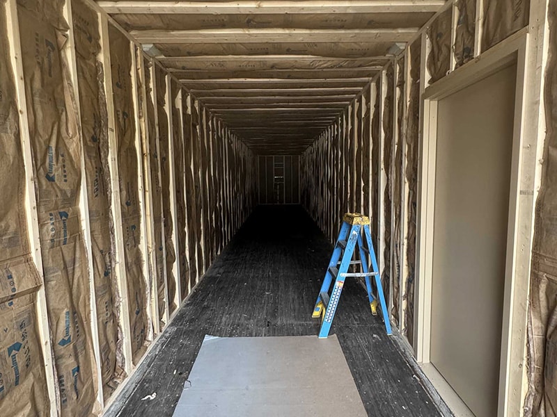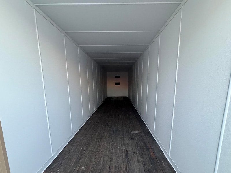 Interior framed with 2” x 4” wood studs 16” O.C., R-13 Fiberglass insulation, and walls paneled with 3/8” thick FRP (fiberglass reinforced plastic) plywood