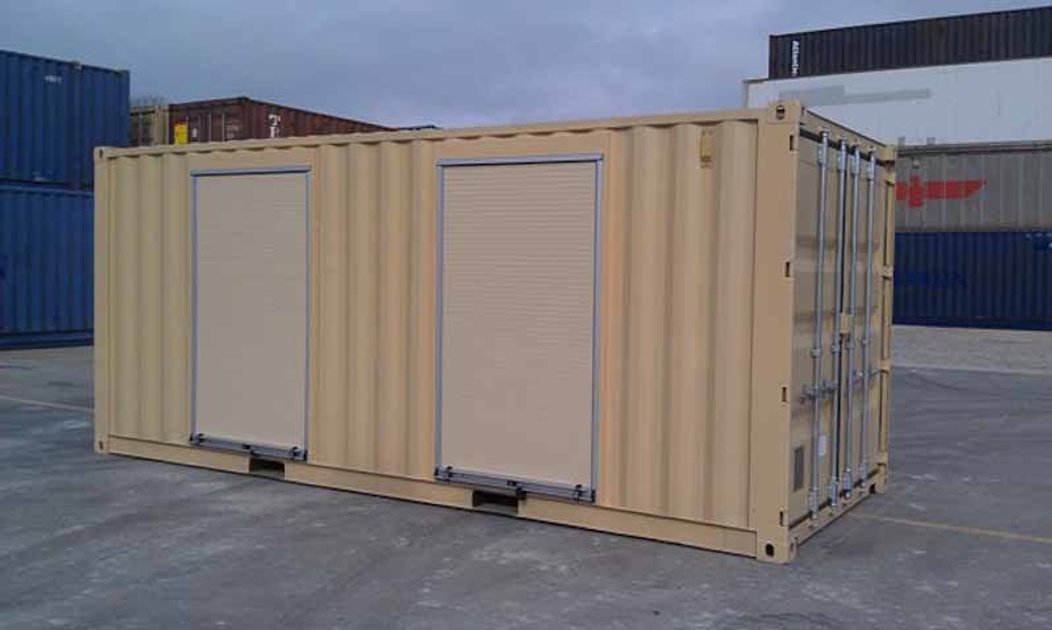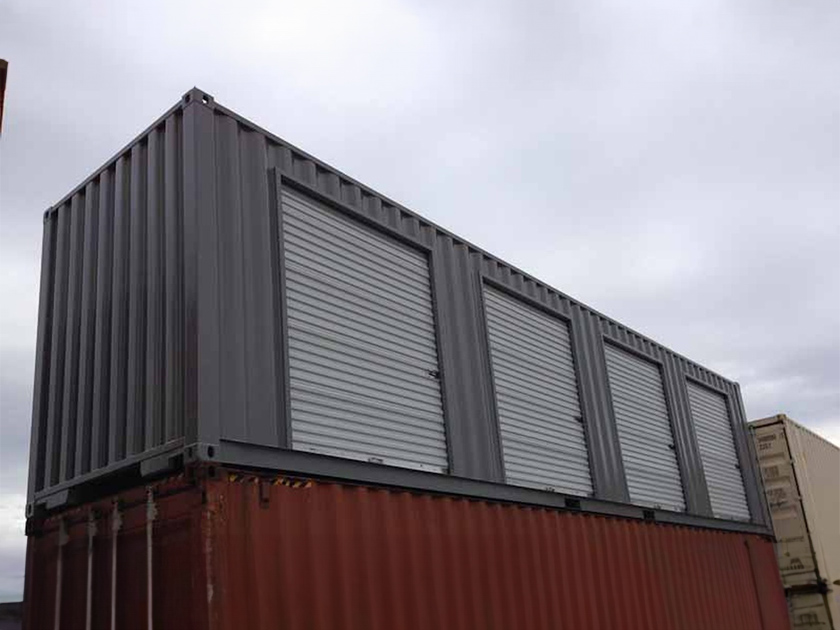 By adding multiple roll up doors, a shipping container can be transformed into a multi-purpose on-site mini storage unit. The mini storage containers can be converted into a variety of configurations. Roll up doors can be installed in the side walls, as well as the front (end opposite the existing doors). The roll up doors come in many different sizes and types. The interior of the mini storage container can also be insulated and heated/cooled. Lights can also be added to illuminate the interior.