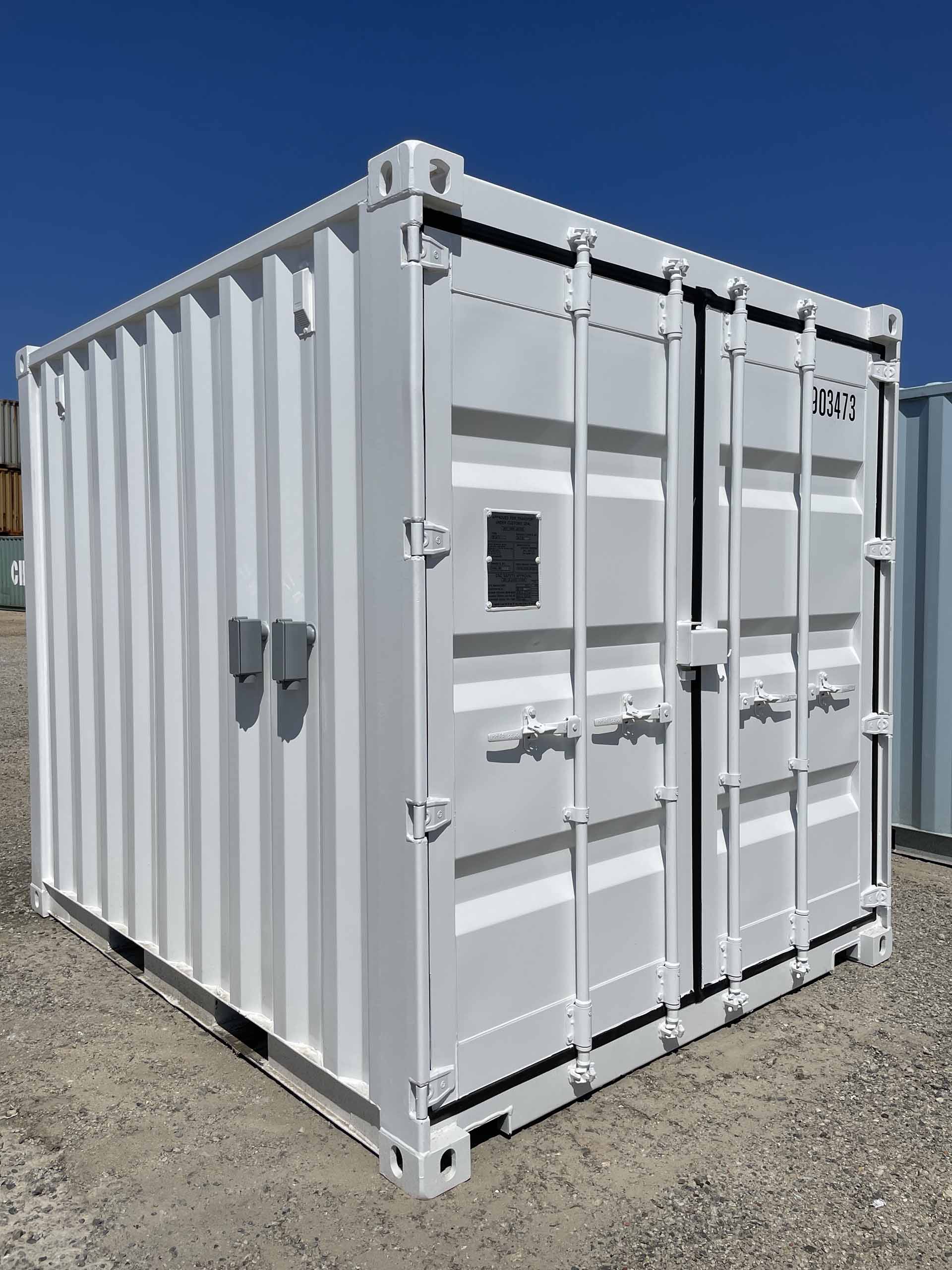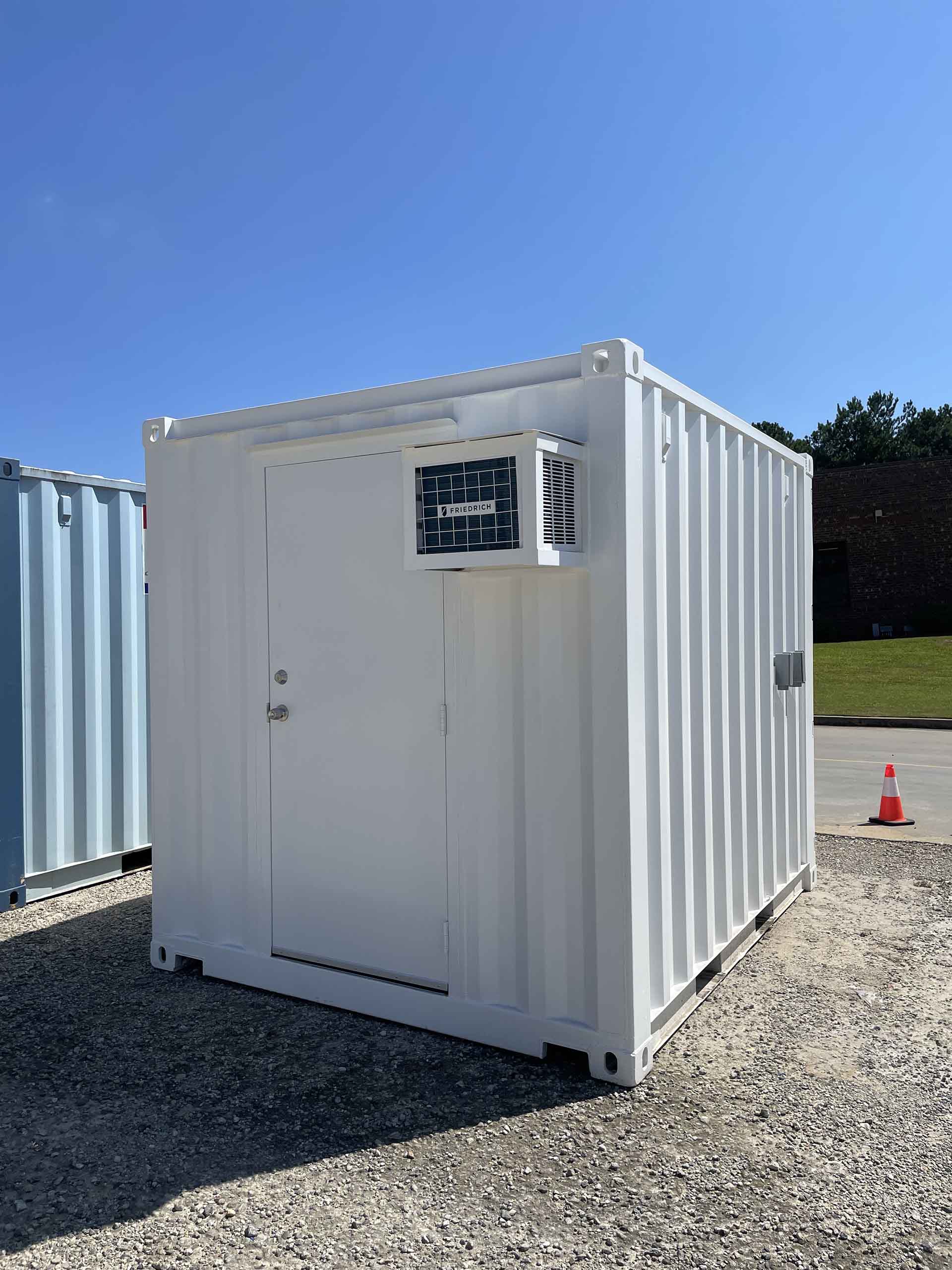 10ft Standard shipping container converted into temperature-controlled mobile office. The container is outfitted with a personnel door, finished interior, lights, outlets, and a small window HVAC unit. A vinyl overlay has been installed over the existing wood floor. The exterior has also been painted white.