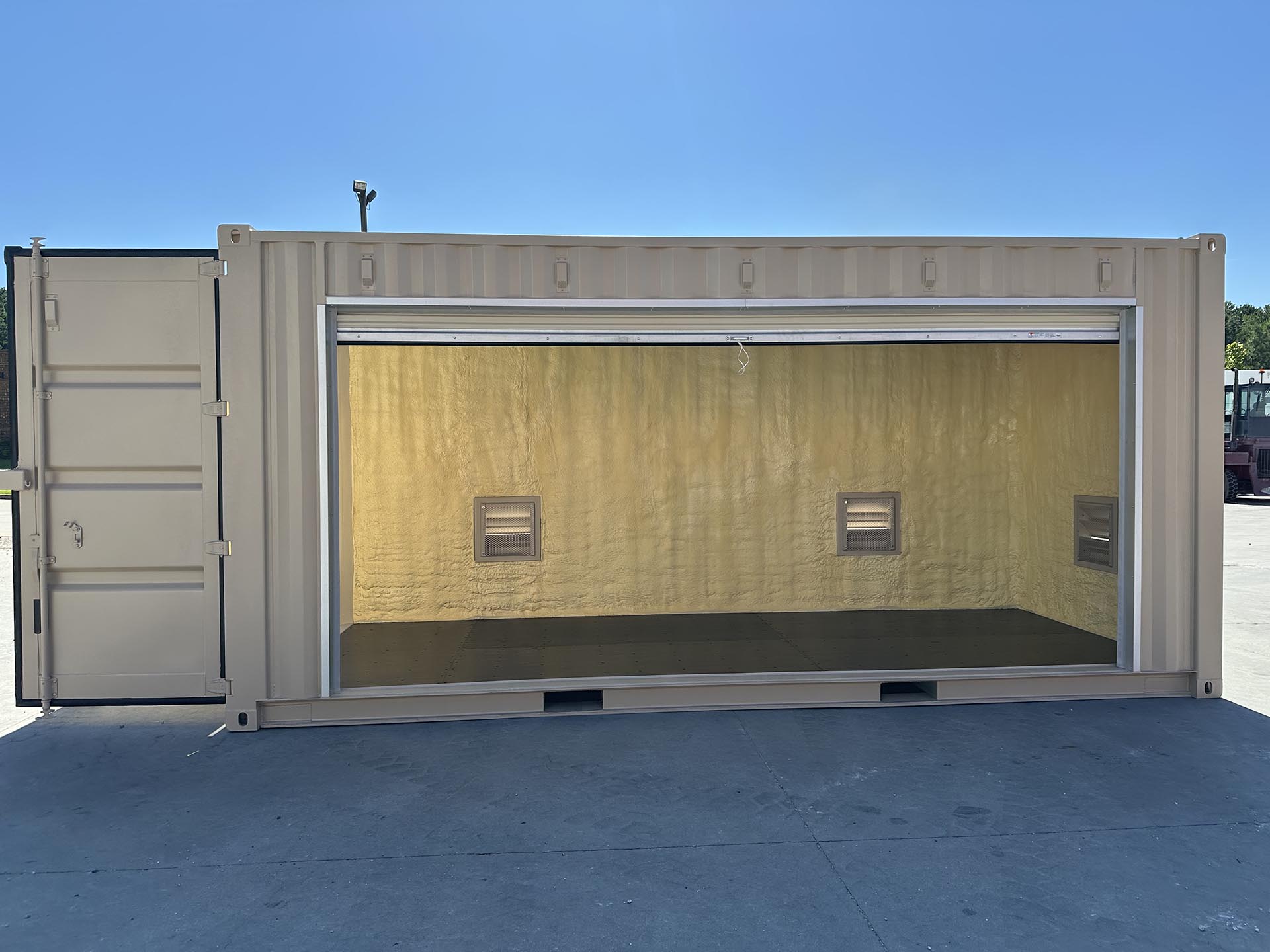 20ft High Cube shipping containers converted into EV battery storage units for automotive companies. Installed large 16ft chain hoist roll up door and multiple fixed louvre vents. The interior is insulated with spray closed cell foam and the exterior of containers are painted black and tan.
