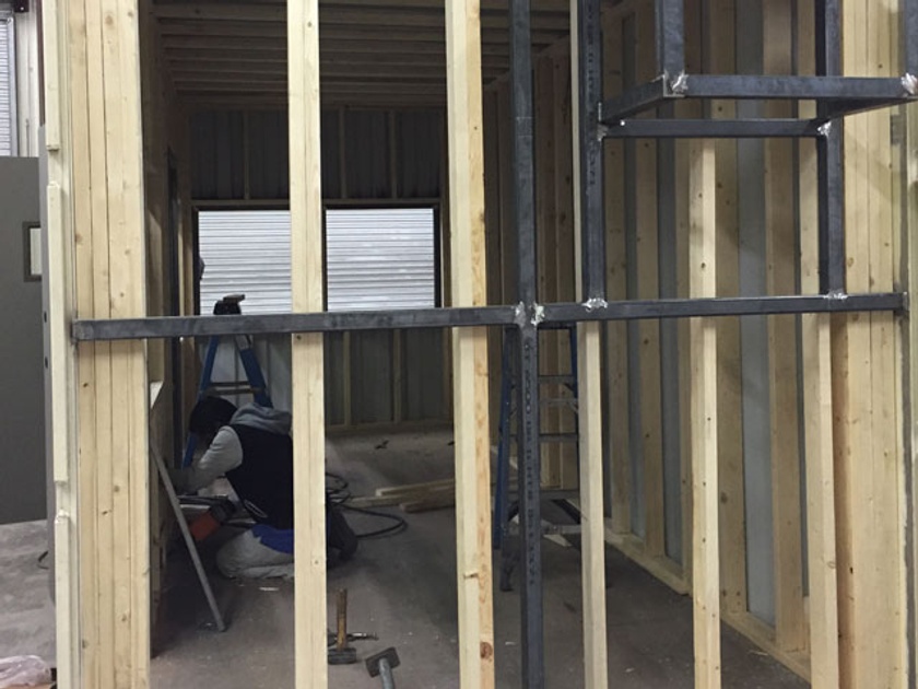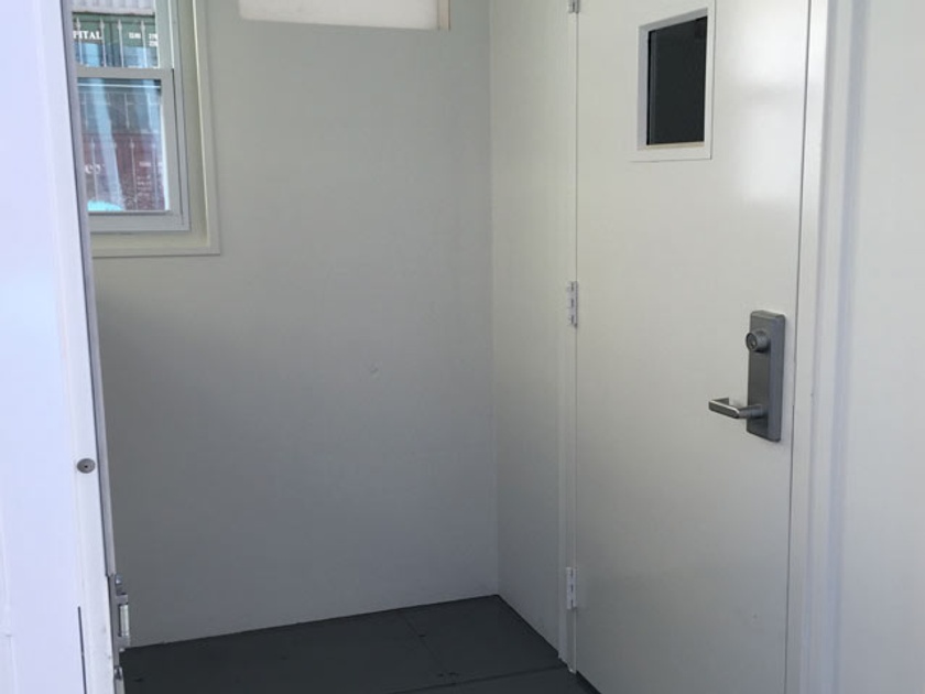- Interior partition w/ 36” solid panel steel door. Door equipped w/ 12” x 12” viewing window and panic hardware