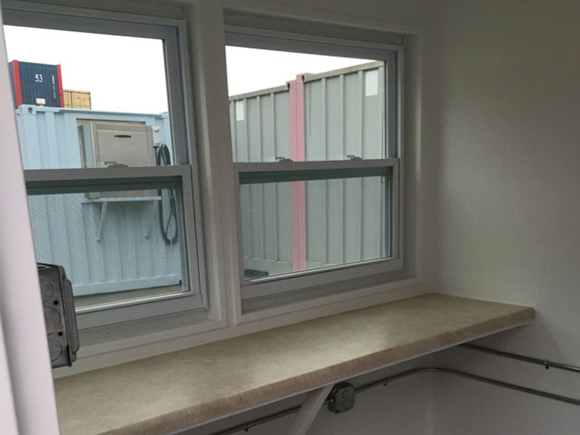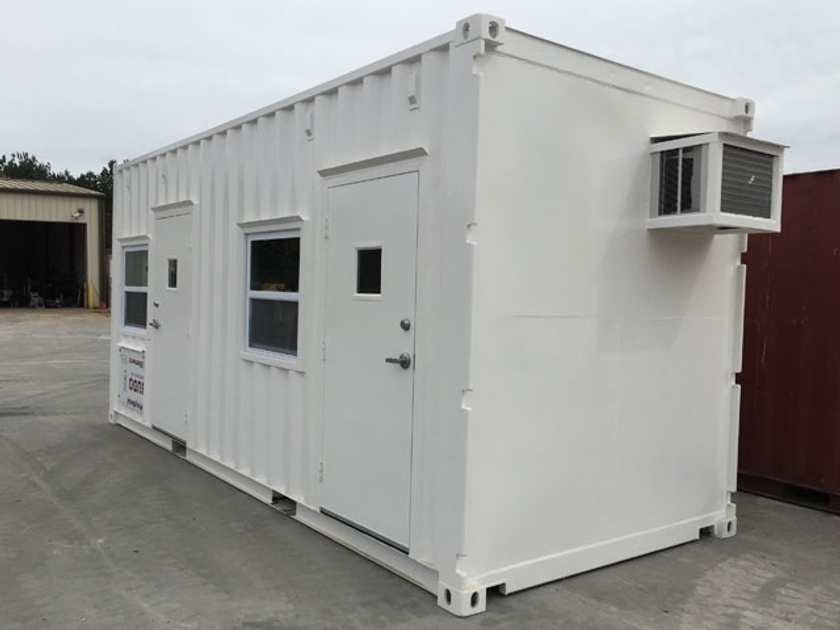 20ft High Cube shipping container converted into temperature controlled mobile control/equipment room. Two personnel doors were installed on one side of the container. A partition was also installed on the interior with a passage door. Electrical was installed throughout, including light, outlets, and two window AC/Heat units. The customer also requested that the floor be painted gray and the existing double doors be removed.
