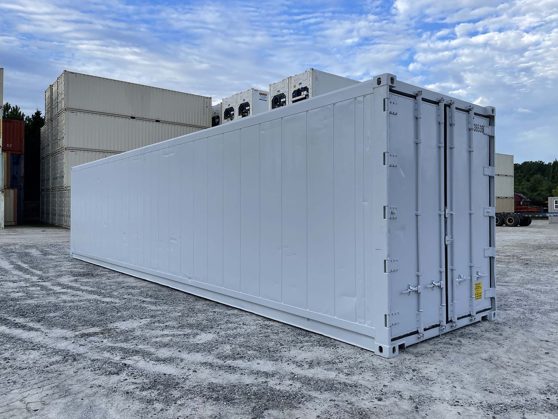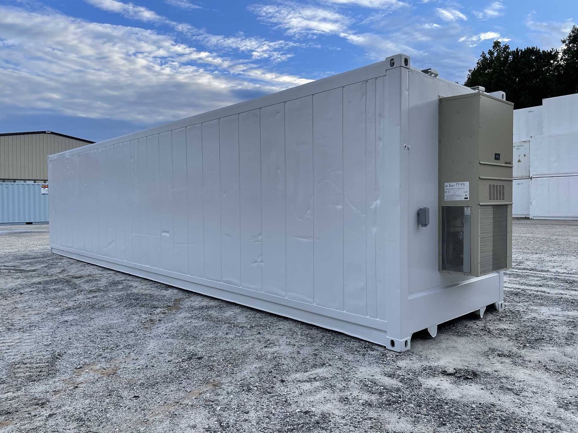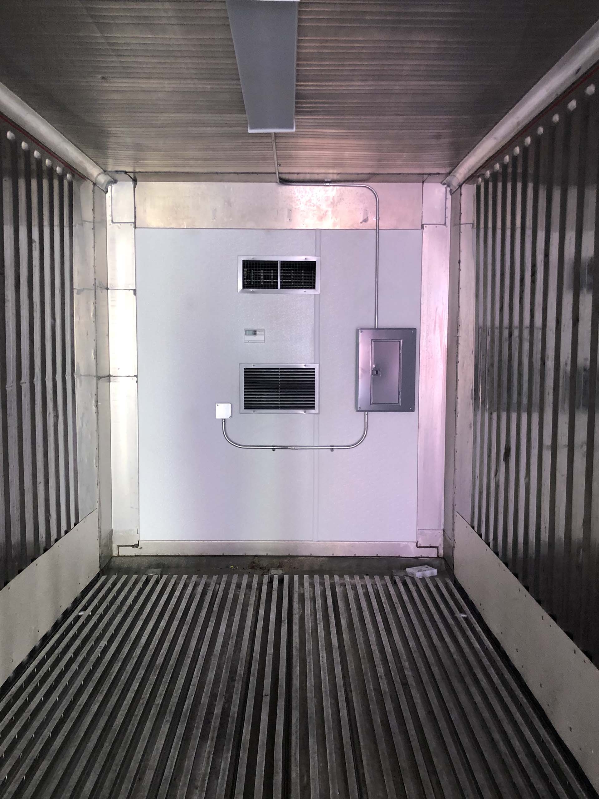 40ft Non-Working Reefer container converted into climate-controlled storage unit for power plant. The non-working cooling system was removed and replaced with a commercial through-wall HVAC system. The unit was outfitted with lights and outlets and the exterior was painted gray.