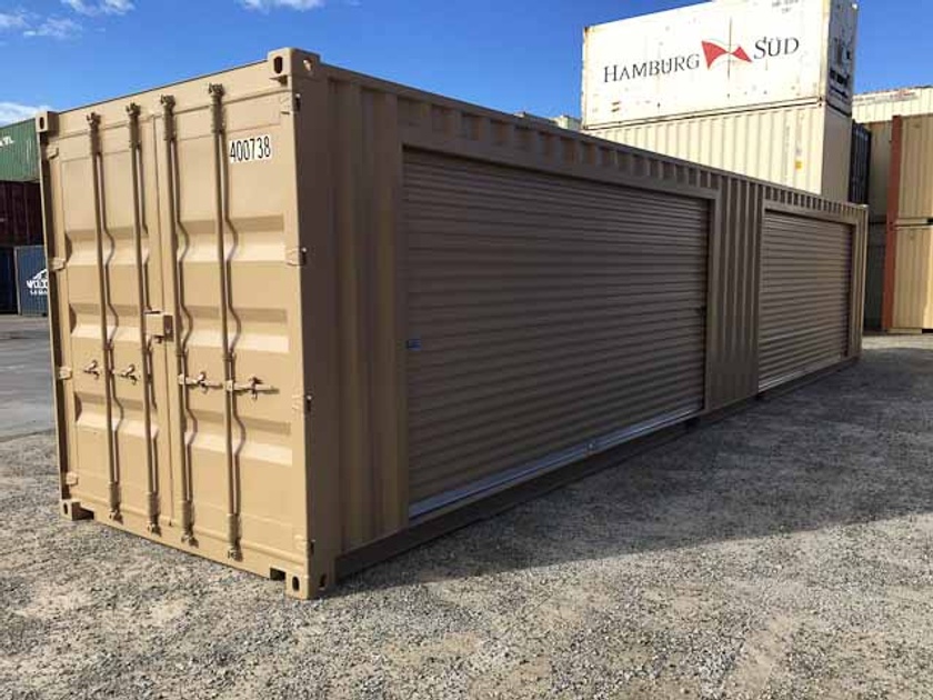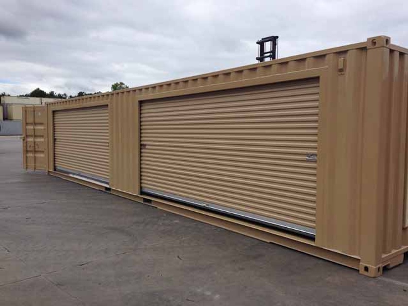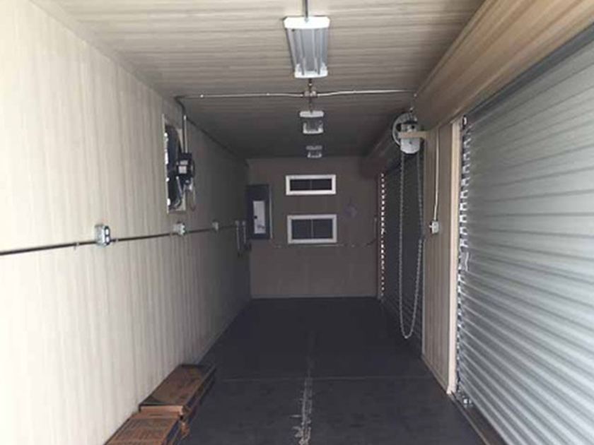 40ft Standard container converted into temperature controlled mini storage unit. Two large roll up doors were installed on one side to allow for larger items to be side loaded. Electrical was installed throughout, including lights, outlets, and a commercial HVAC system. The customer also requested a steel overlay on the floor.