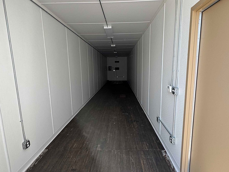 This 53’HC container was converted into a climate controlled mobile office space for a military base. The interior was completely finished and outfitted with lights, outlets, and a commercial HVAC system. An additional door was installed on the sidewall and the exterior was painted gray.