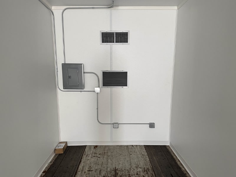 (8) 4’ LED lights, (1) exterior porch light, switches, (3) 110V duplex receptacles interior, (2) 110V duplex receptacles exterior, 100-amp panel stubbed to exterior for hardwiring to shore power