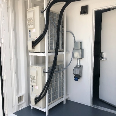 A mini-split system is also referred to as a ductless HVAC system. It’s an electrical heating and cooling system that uses an outdoor compressor and one or more indoor air handlers to provide zone-specific temperature control. This type of system does so without a network of ducts. A mini-split system is a great option for container applications when space is limited.