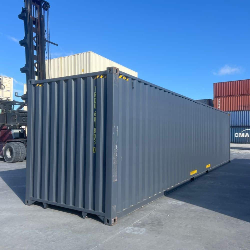 New containers are called “one trip” containers. They are loaded with cargo and shipped to the US one time. They are not utilized in shipping service. Typically, they do not have shipping line decals and will have very few blemishes. **HC (high cube) containers are 1’ taller than a standard height container.